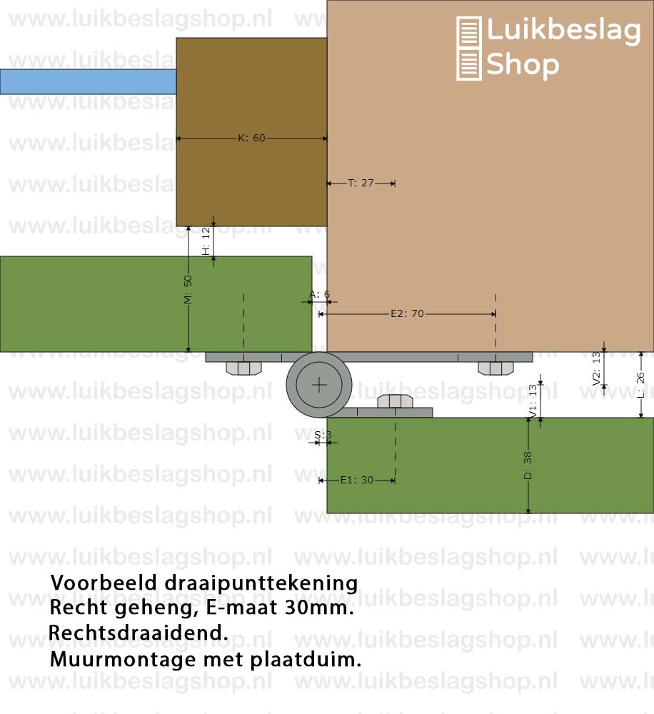 De montagegaten zijn 9mm. Er kunnen M8 houtdraadbouten of slotbouten worden gebruikt om de hengen te monteren.